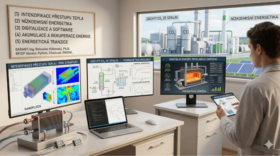 Student si vybere jedno z nabízených témat z oblasti procesního inženýrství, energetiky nebo digitalizace. Témata zahrnují moderní metody intenzifikace přestupu tepla v mini- a mikro-kanálech, pasivní intenzifikační prvky (turbulizátory), využití nanofluid jako teplonosných médií, nízkoemisní technologie záchytu CO₂ ze spalin, digitální dvojčata tepelných zařízení, rekuperaci tepla ze šedých vod a vodíkové technologie. Každé téma je zpracováváno jako samostatná práce s individuálním zadáním přizpůsobeným schopnostem a zájmu studenta.